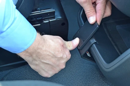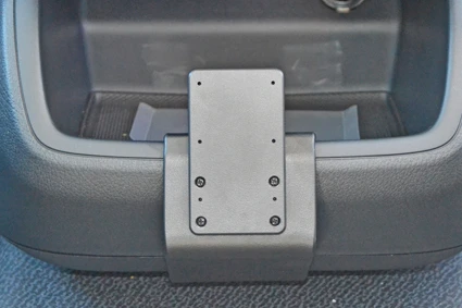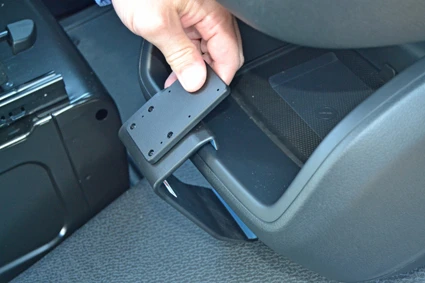 Use the enclosed alcohol pad to clean the area where the ProClip is to be installed. Remove the adhesive tape covers on the ProClip. Hook the angled upper edge of the ProClip around the edge of the center console storage cubby.