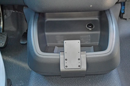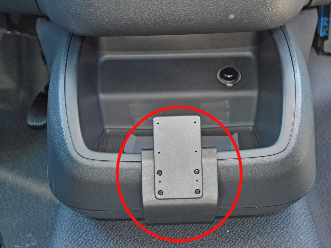 Press the lower part of the ProClip downward until you hear/feel the lower angled edge of the ProClip snap into place under the edge of the center console storage cubby.