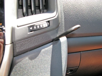 Insert the thin end of the enclosed gap opener into the gap dividing the left part of the center console, to widen the gap. Use the enclosed alcohol pad to clean the area where the ProClip is to be installed. Remove the adhesive tape cover on the ProClip. Point the air vent flaps rightward.