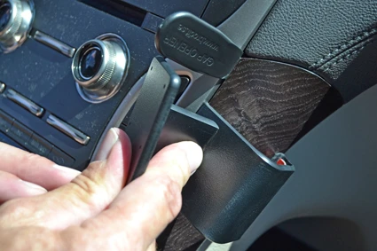 Press the thin end of the gap opener into the gap between the console sidewall and the padded part of the dashboard, to widen the gap. Push firmly forward on the right side of the ProClip so the angled right edge flexes forward and hooks into the gap next to the gap opener. Remove the gap opener.