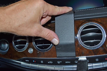 Use the enclosed alcohol pad to clean the area where the ProClip is to be installed. Insert the thin end of the enclosed gap openers into the gap between the airvents below the information display and the padded part of the dash, to widen the gap. Make sure to place the gap openers on either side of the clock.