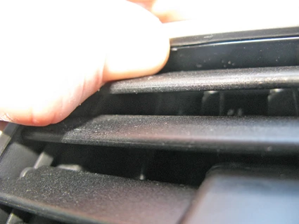 Use the enclosed alcohol pad to clean the area where the ProClip is to be installed. Peel off the adhesive tape covers on the ProClip. Use your thumb and gently press upward on the upper part of the air vent, to widen the gap slightly.