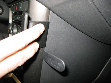 Use the enclosed alcohol pad to clean the area where the ProClip is to be installed. Press the thin end of the enclosed gap opener into the gap between the frame surrounding the control panel and the center console sidewall, to widen the gap. Peel off the adhesive tape cover on the ProClip. Hook the left edge of the ProClip, with adhesive tape, over the frame surrounding the control panel.
