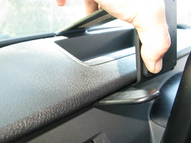 Use the enclosed alcohol pad to clean the area where the ProClip is to be installed. Press the thin end of the enclosed gap opener into the gap between the dashboard overhang and the dashboard below, to widen the gap. Peel off the adhesive tape cover on the ProClip. Press the angled edge on the lower part of the ProClip into the gap next to the gap opener. Pull out the gap opener.