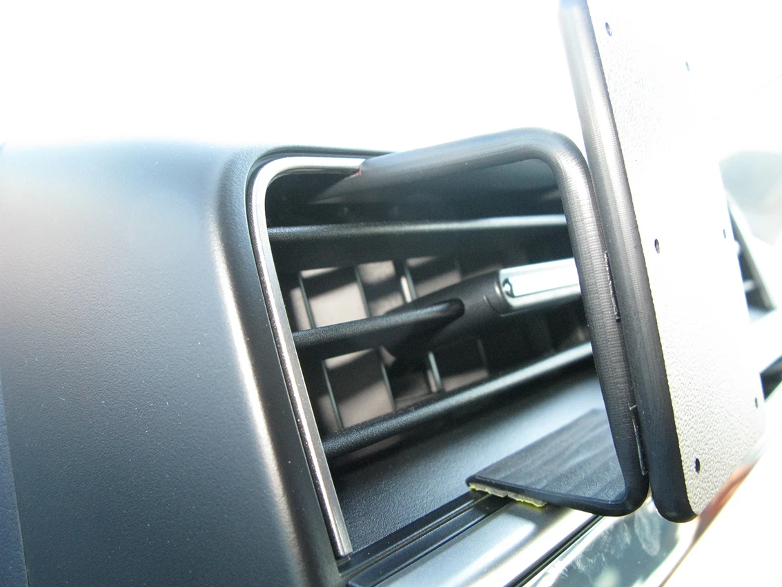 Use the enclosed alcohol pad to clean the area where the ProClip is to be installed. Peel off the adhesive tape covers on the ProClip. Place the upper part of the ProClip into the upper part of the air vent so the upper edge rests onto the edge of the air vent house.