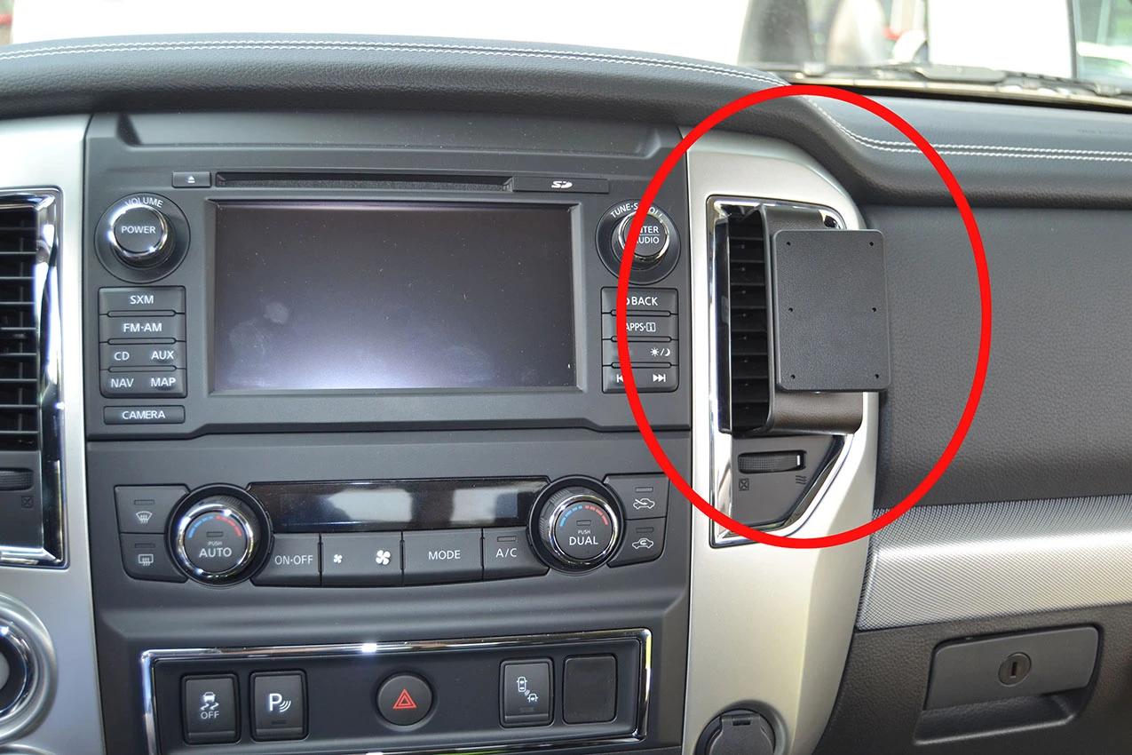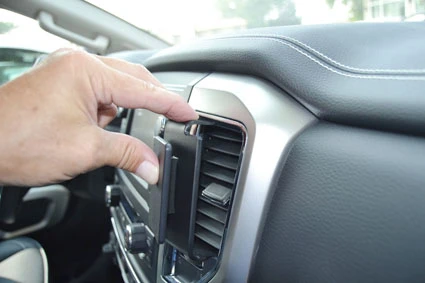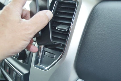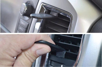 Press the top of the ProClip downwards and hook the angled upper edge into the gap betwen the air vent and the surrounding frame. Wiggle the ProClip so the angled edge goes all the way into the gap.