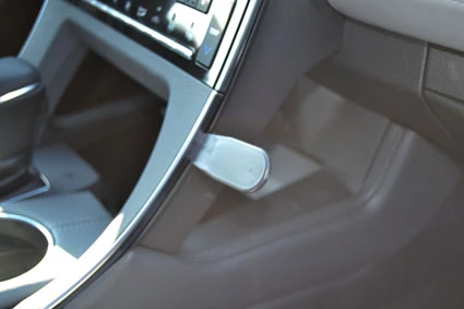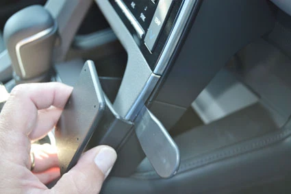 Press forward on the left side of the ProClip so the left J shaped edge hooks into the seam behind the center console post. Pull out the gap opener.