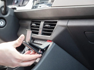 Press the upper part of the ProClip upward/forward. Hook the upper edge of the ProClip into the gap between the dashboard surrounding the air vent and the center dashboard panel.