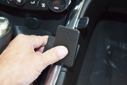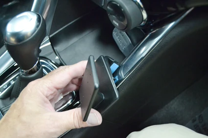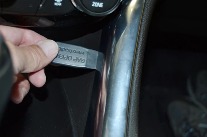 Use the enclosed alcohol pad to clean the area where the ProClip is to be installed. Press the thin end of the enclosed gap opener into the gap between the chrome console trim and the inner center console panel, to widen the gap. Peel off the adhesive tape cover on the ProClip.