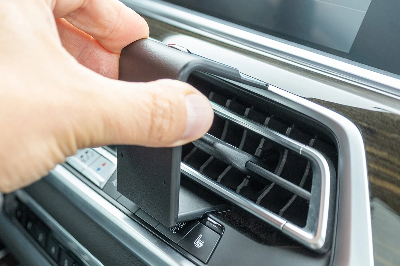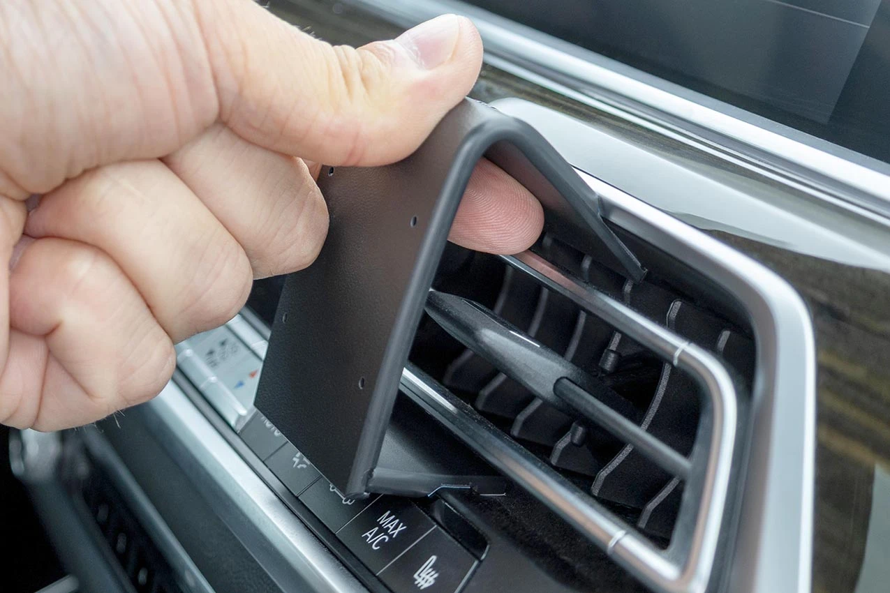 Press down and all the way forward on the top of the mount, so the upper edge hooks/clips under the frame surrounding the air vent.