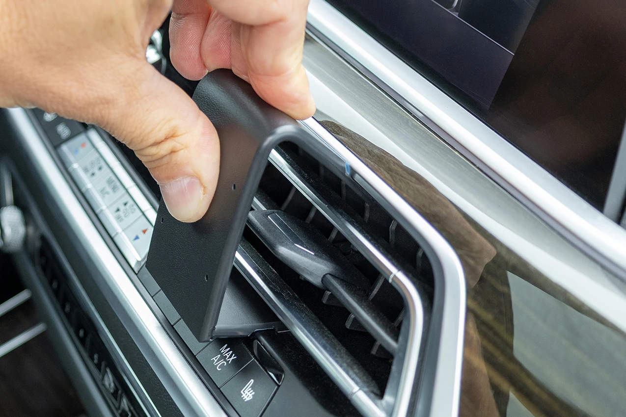 Use the enclosed alcohol pad to clean the area where the mount will be installed. Peel off the adhesive tape cover. Place the bottom edge of the mount on the frame surrounding the air vent.