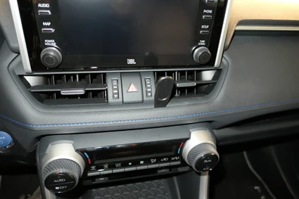 Press the ProClip downward and forward so the upper edge hooks under the frame surrounding the air vent. Press the lower part of the ProClip, with adhesive tape, into the gap between the dashboard and the control panel. Pull out the gap opener.