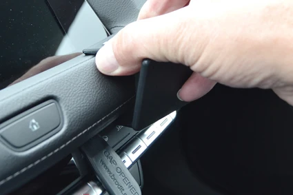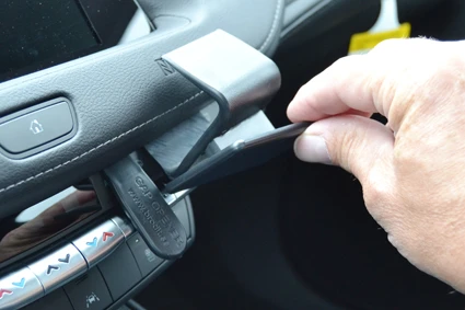 Press forward on the ProClip until the thin front edge goes into the gap between the display and the padded dashboard. Pull out the gap opener.