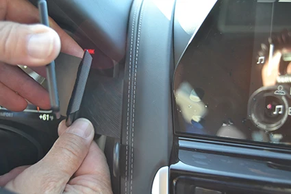 Use the enclosed alcohol pad to clean the area where the ProClip is to be installed. Peel off the adhesive tape cover on the the ProClip. Press the thin edge of the enclosed gap opener into the gap between the panel surrounding the instrument panel and the dashboard, to widen the gap.