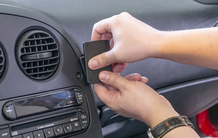 Use the enclosed alcohol pad to clean the area where the ProClip is to be installed. Peel off the adhesive tape cover on the ProClip. Press the thin right edge of the ProClip into the gap between frame surrounding the center console and the dashboard.