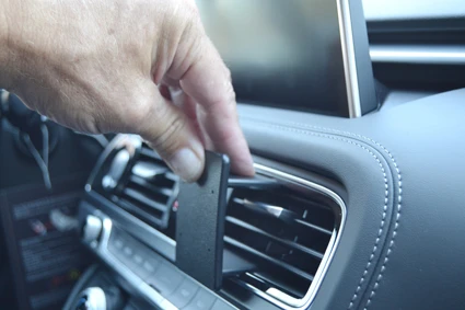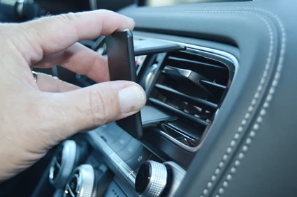 Press down on the top of the ProClip and hook the top notched edge under the air vent frame.