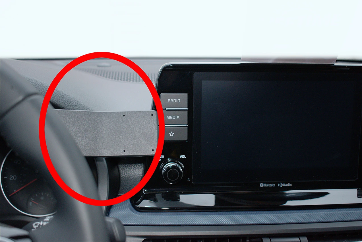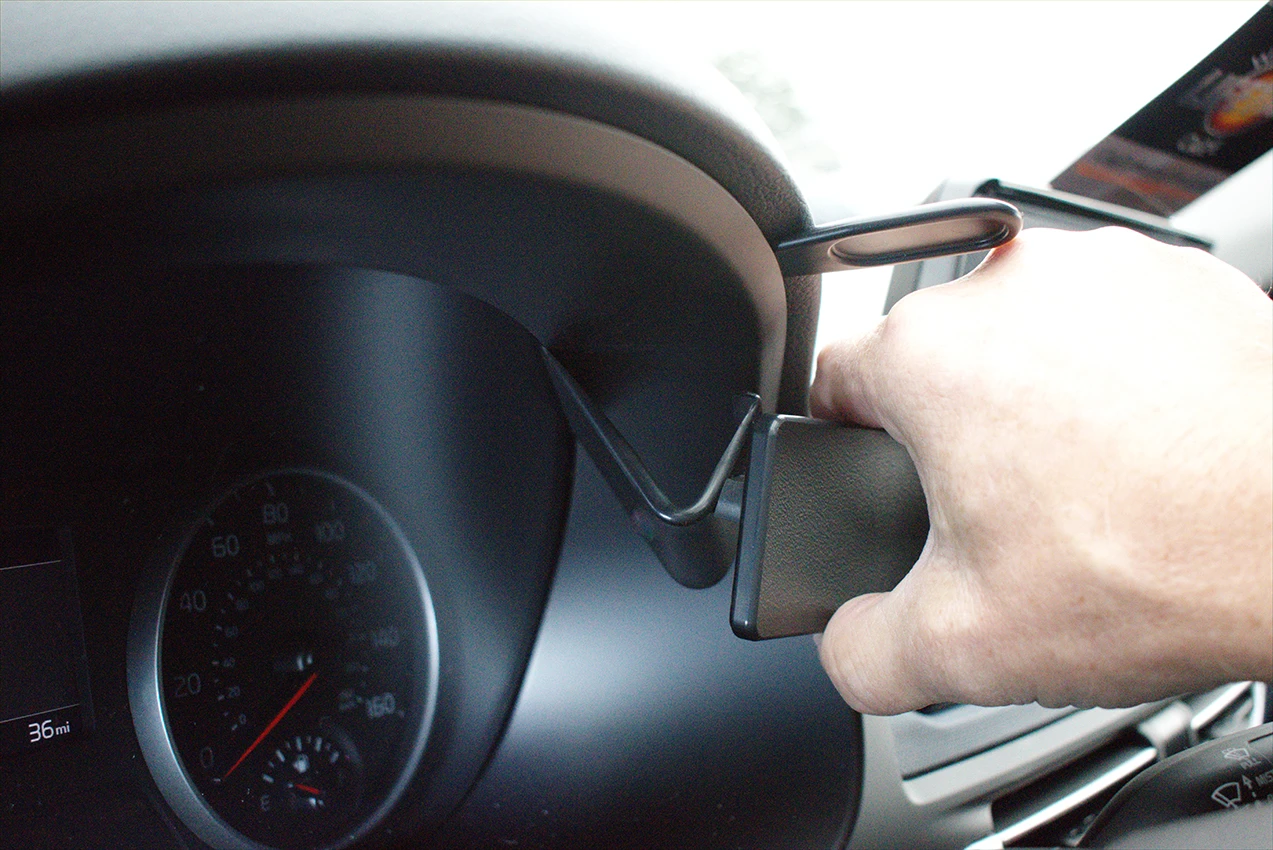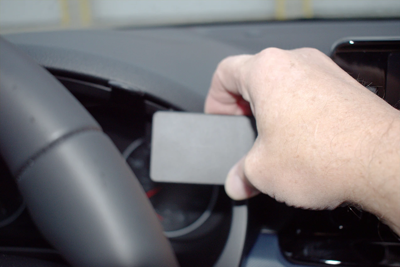 Use the enclosed alcohol pad to clean the area where the ProClip is to be installed. Press the thin end of the enclosed gap opener into the gap between padded dashboard top and the plastic frame around the speedometer, to widen the gap. Peel off the adhesive tape cover on the ProClip. Hook the left edge of the ProClip into the gap between the clear plastic and the frame around the speedometer.