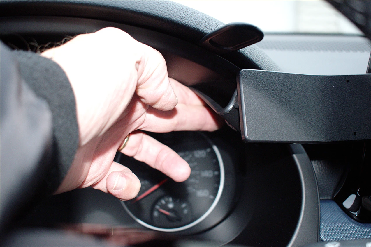 Press in on the forward edge of the ProClip to make sure it stays hooked onto the panel while you rotate the mount rightwards. Pull the mount towards you and hook the right edge of the ProClip into the gap next to the gap opener.