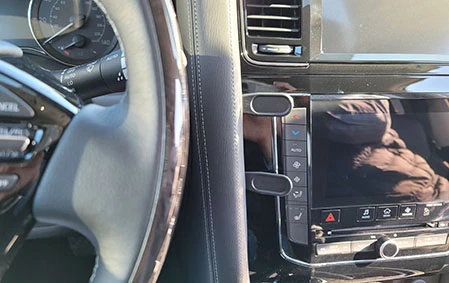 Press the thin end of the enclosed gap opener into the gap between the control panel and the padded frame, to widen the gap. Use the enclosed alcohol pad to clean the area where the ProClip is to be installed. Peel off the adhesive tape covers on the ProClip.