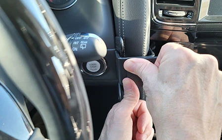 Press the left part of the ProClip forward so the grooved edge hooks into the gap between the padded frame and the dashboard. Pull out the gap openers.