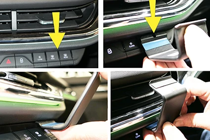 Use the enclosed alcohol pad to clean the area where the ProClip is to be installed. Peel off the adhesive tape cover on the ProClip. Localize the button separator by the last/first button, see arrow on the picture. Place the U-shaped groove in the lower part of the ProClip exactly over the button separator. Press the angled edge into the gap between the trim and the dashboard. Press/Flip the upper part of the ProClip forward so the angled lower edge hooks behind the trim.