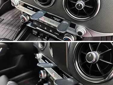 Press the thin end of the enclosed gap openers into the gap between the soft dashboard surrounding the air vents and the control panel, to widen the gap. Press the lower edge of the ProClip into the gap between the gap openers. Pull out the gap openers.