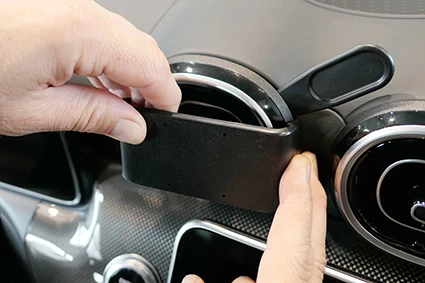 Press the thin end of the enclosed gap opener into the gap between the frame surrounding the air vent and the dashboard placed on the upper right side, to widen the gap. Use the enclosed alcohol pad to clean the area where the ProClip is to be installed. Peel off the adhesive tape cover on the ProClip. Press the angled edge on the right part of the ProClip in to the gap below the gap opener.