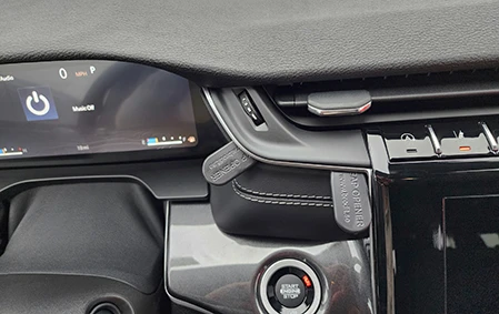 Use the enclosed alcohol pad to clean the area where the ProClip is to be installed. Insert the gap openers into the seam behind the leather trim next to the engine start button, on either side of the mount. (See photo). Apply even downward pressure that will flex the mount into the soft material and hook it underneath.