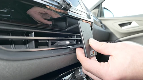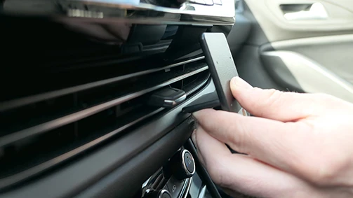 Use the enclosed alcohol pad to clean the area where the ProClip is to be installed. Peel off the adhesive tape covers on the ProClip. Press the upper part of the ProClip in the gap under the frame surrounding the air vent.