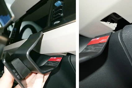 Open the glove compartment. Use the enclosed alcohol pad to clean the area where the ProClip is to be installed. Remove the adhesive tape covers on the ProClip . Press the angled bottom of the Proclip into the gap between the glove compartment and the dashboard, right next to the hole for the hinge.