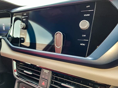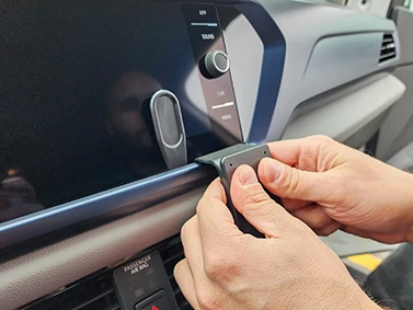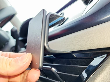 Installing the Upper Lip: Gently clean the area where the ProClip mount will attach. Remove the adhesive tape cover. Insert the supplied gap opener into the seam between the bottom of the infotainment screen and the trim piece.