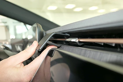 Use the enclosed alcohol pad to clean the area where the ProClip is to be installed. Peel off the adhesive tape covers on the ProClip. Press the upper part of the ProClip in the gap under the frame surrounding the air vent.