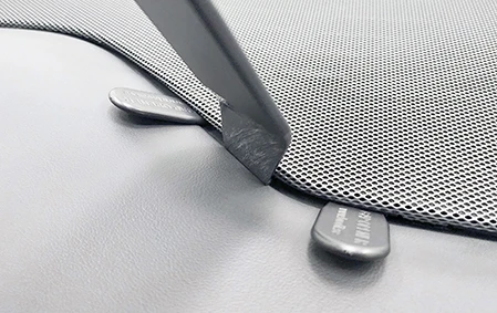 Insert the included gap openers, as shown, to lift the edge of the speaker grill on top of the dashboard. Use the enclosed alcohol pad to clean the area where the PoClip is to be installed. Remove the adhesive tape cover on the ProClip. Insert the angled edge of the Proclip under the lifted speaker grill. Then tilt the Proclip down towards the dash so the angled egde slides under the grill.