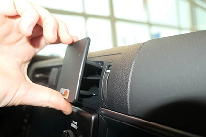 Use the enclosed alcohol pad to clean the area where the ProClip is to be installed. Peel off the adhesive tape cover on the ProClip. Hook the grooved edge on the upper part of the ProClip under the frame surrounding the air vent.