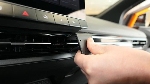 Press upwords and forward on the faceplate of the and insert the lower lip into the gap between the vent and the trim. Press upward with your thumb to make sure the upper lip is fully inserted and the tape attaches properly.
