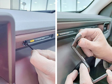 Remove the mounting screw: There is a hex screw to the left of the passenger airbag indicator. Use the included Allen key to remove this screw from the dash. Thread the mount into place: Insert the screw into the hole on the mount.