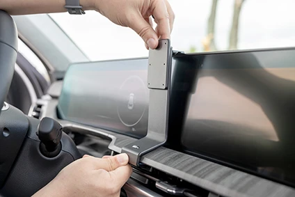 Install the Lower Lip: Use the enclosed alcohol pad to gently clean the area where the mount will be installed. Remove the backing from the adhesive tape. Align the mount between the instrument and infotainment screens. Place the lower lip fully under the dashboard ridge