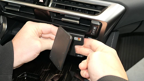 Use the enclosed alcohol pad to clean the area where the mount will be installed. Peel off the adhesive tape cover. Press the thin lower edge of the mount into the gap between the compartment and the center console.