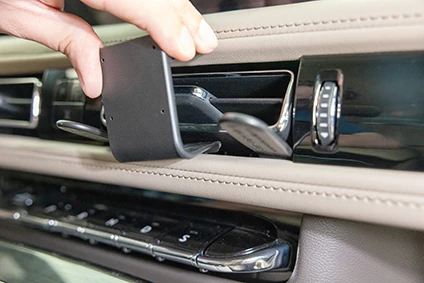 Use the enclosed alcohol pad to clean the area where the ProClip is to be installed. Remove the adhesive tape cover on the ProClip. Insert the thin ends of the enclosed gap openers into the gap between the air vent panel and the remainder of the dashboard, to widen the gap.