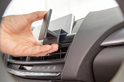 Use the enclosed alcohol pad to clean the area where the mount will be installed. Remove the adhesive tape cover. Press the lower angled edge into the gap between the air vent housing and the trim.