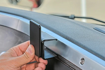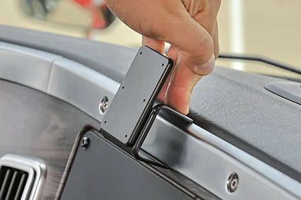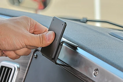 Use the enclosed alcohol pad to clean the area where the mount will be installed. Peel off the adhesive tape cover. Press the lower edge of the mount under/behind the dashboard trim.