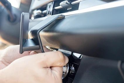 Lift the top of the mount over the dashboard trim. Hook the upper edge of the mount into the gap between the air vent housing and the dashboard trim.