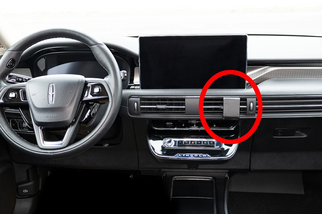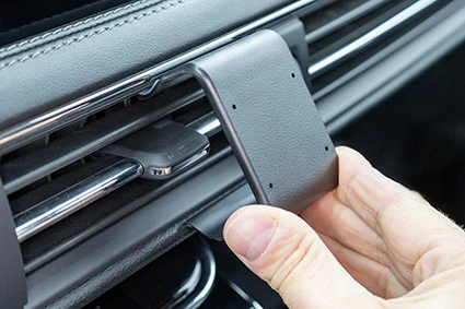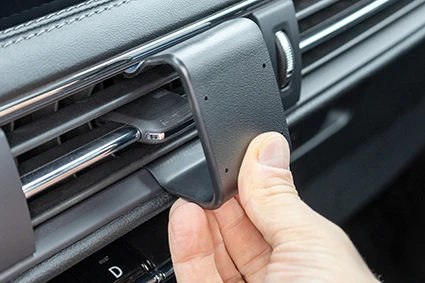 Use the enclosed alcohol pad to clean the area where the mount will be installed. Peel off the adhesive tape cover. Place/Hook the upper edge of the mount under the air vent housing top.