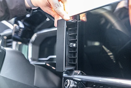 Press the mount downward and forward. Clip/hook the upper edge of the mount under the frame surrounding the air vent.
