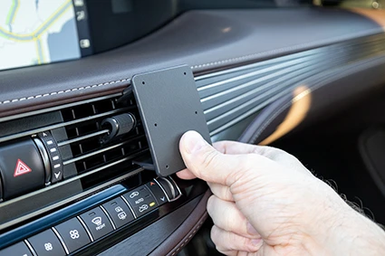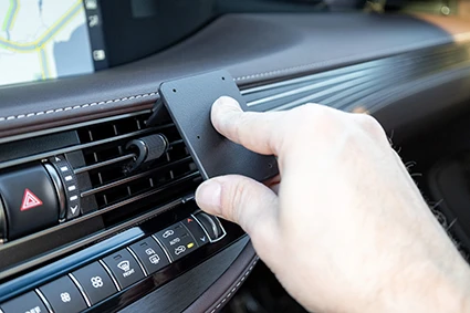 Use the enclosed alcohol pad to clean the area where the mount will be installed. Peel off the adhesive tape cover. Place the mount by the right side of the air vent so the short side of the upper and lower parts are toward the driver's side. Hook the upper edge under the frame surrounding the air vent.