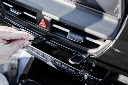 Press the thin ends of the included gap openers into the gap between the frame surrounding the air vent housing and the trim below it, to widen the gap. Place one under the hazard lights button and one under the right corner of the air vent. Use the enclosed alcohol pad to clean the area where the mount will be installed. Peel off the adhesive tape cover.