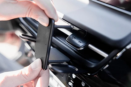 Press the upper part of the mount downward and forward. Clip/Hook the upper edge into the gap between the air vent housing and the dashboard trim. Press downward and upward inside the mount so the adhesive tapes make full contact with the dashboard
