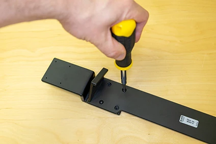Hold the mount base with the recessed side pointing downwards, the straight side pointing upwards. Choose if you prefer to have the device installed on the driver's or passanger's side of the screen, and place the face plate onto the corresponding side of the mount. Make sure the face plate is on the correct side and attach it to the mount base with the included screws (Phillips screwdriver).