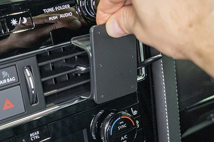 Press downward and forward on top of the mount. Hook/Clip the upper edge into the gapbetween the air vent housing and the dashboard panel.