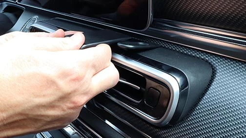 Use the enclosed alcohol pad to clean the area where the mount will be installed. Press the thin edge of the included gap opener into the gap between the frame surrounding the air vent and the dashboard, to widen the gap. Peel off the adhesive tape cover. Press the lower edge of the mount into the gap between the trim and the center console and hook the angled edge under the trim.